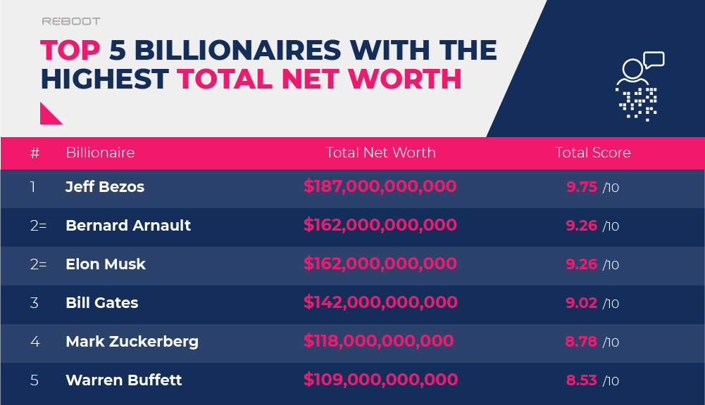 Ranking in first place is Amazon founder, Jeff Bezos. The businessman has earned himself the highest total net worth of approximately $188 billion USD based on Bloomberg's current real-time statistics, resulting in a top score of 9.75