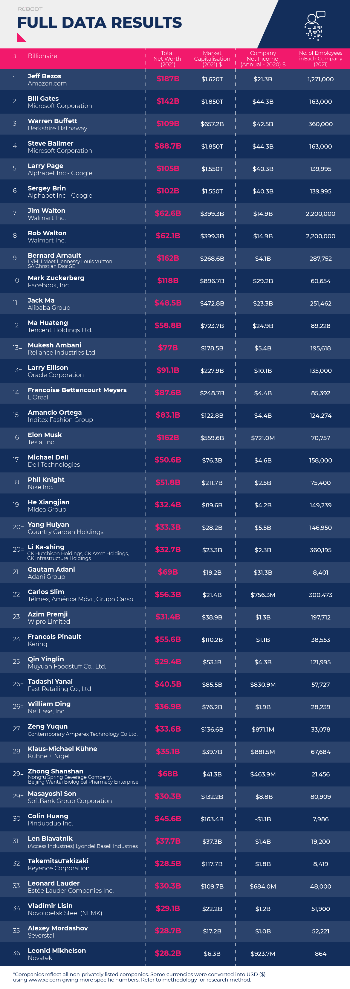 To find our list of billionaires, we based our study on real-time ranking obtained from the Bloomberg Billionaires Index, collecting a list of 40 billionaires in total. Using this, we have collated an index drawing information for the following key variables that best measure success: