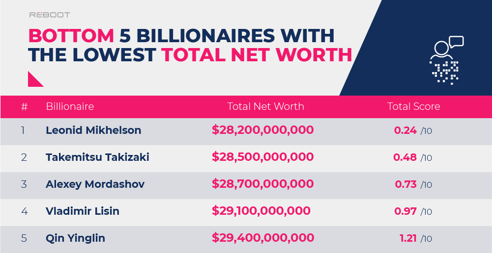 Rounding off the bottom five is the founder and honorary chairman of Keyence Corporation, Takemitsu Takizaki, acquiring an average total score of 2.50 out of 10 and ranking him in 32nd overall. Takizaki holds the second lowest total net worth at roughly $28.5 billion USD, and has the fourth lowest number of employees in total (8,419), making him one of the 'least successful' billionaires of those studied.