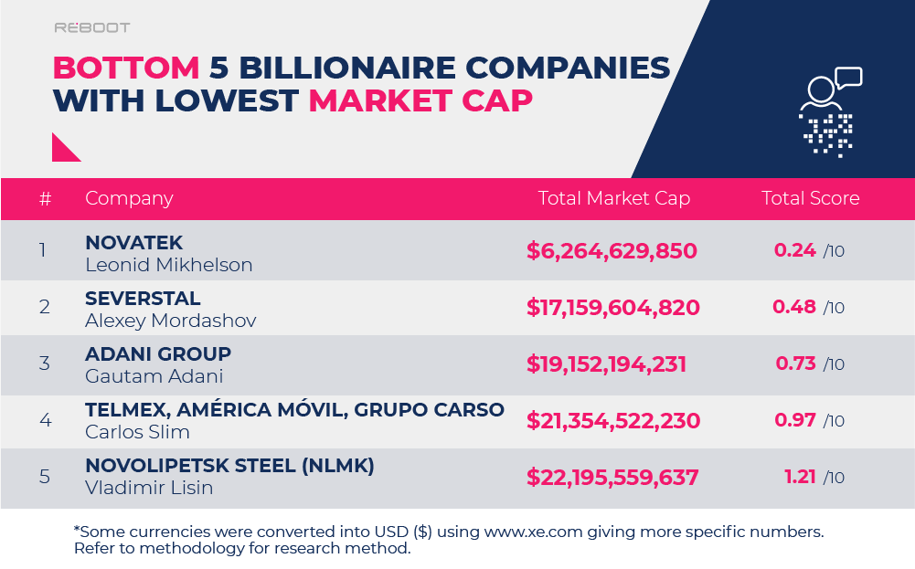 Following with a total score of 1.70 out of 10 is Alexey Mordashov, the majority shareholder and former CEO of the steel company Severstal. Mordashov's company has a total net worth valued at $28.7 billion USD and a market cap of $17.2 billion USD, both of which resulted in low scores in our study.