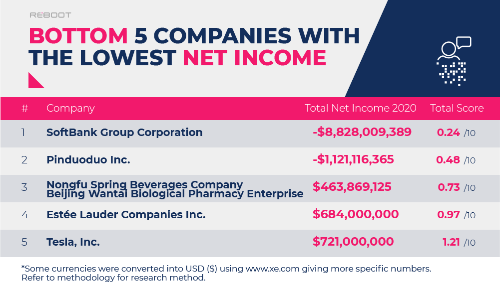 Microsoft tops the list once again with a net income of approximately $44.3 billion USD – the highest of all business studied in 2020. As a result, the company earned a score of 9.51 in our study.
